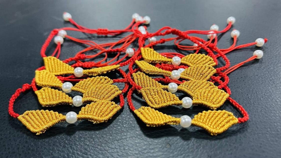慰问现场,老师们为老挝留学生带来了 “梦想之翼” 红绳手链制作教学。这款寓意深远的手链以喜庆红绳为主线,搭配象征吉祥的金线,融合蛇结、雀头结、斜卷结、平结等多种经典中式结法,辅以穿珠工艺与四股辫编织,最终呈现出一对灵动别致的翅膀造型。老师们细致讲解每一种结艺的编织技巧,耐心指导留学生们动手实践,现场欢声笑语不断。